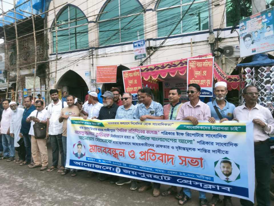 গাজীপুরে সাংবাদিক তুহিন হত্যার প্রতিবাদে জয়পুরহাটে মানববন্ধন ও প্রতিবাদ সভা অনুষ্ঠিত…..